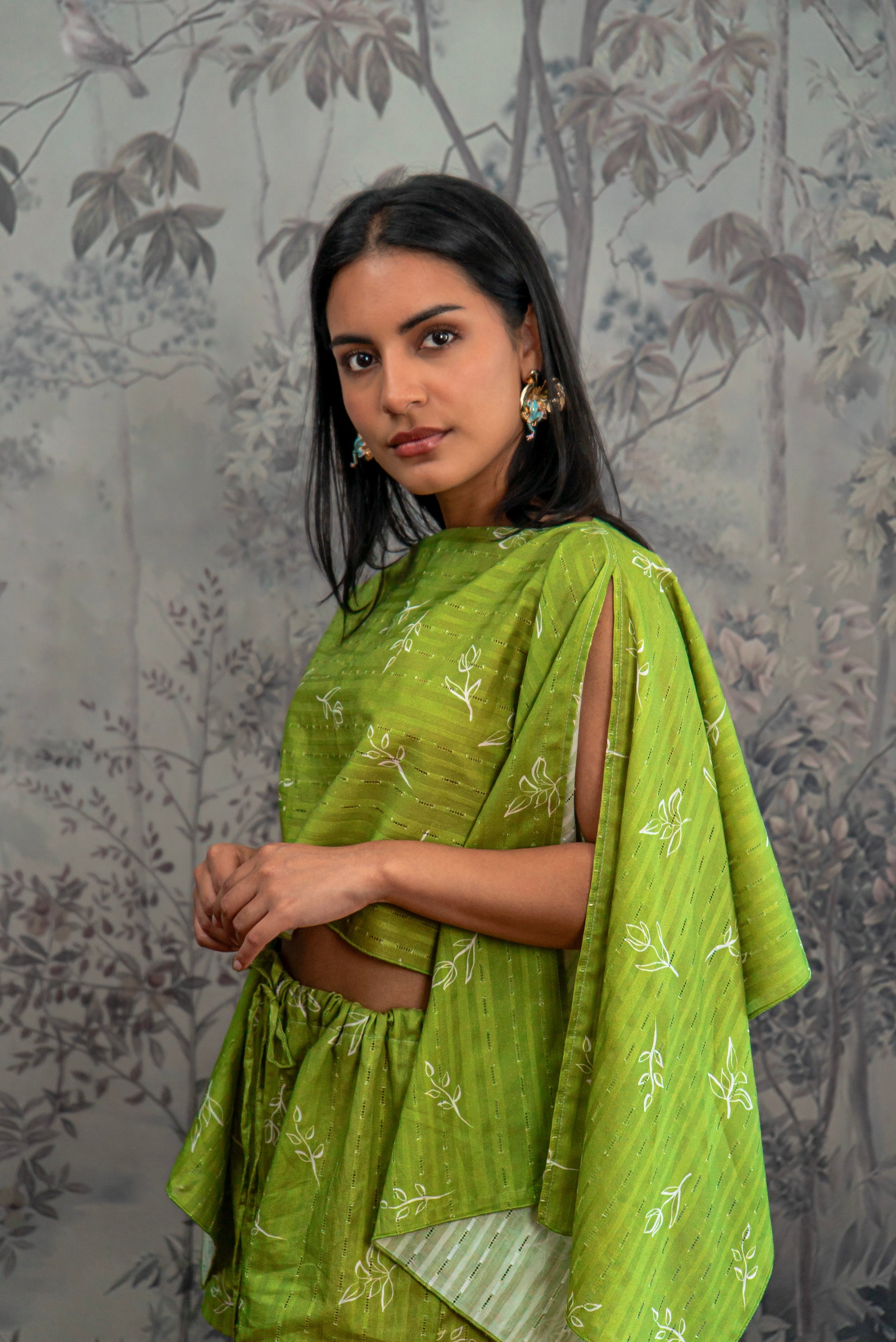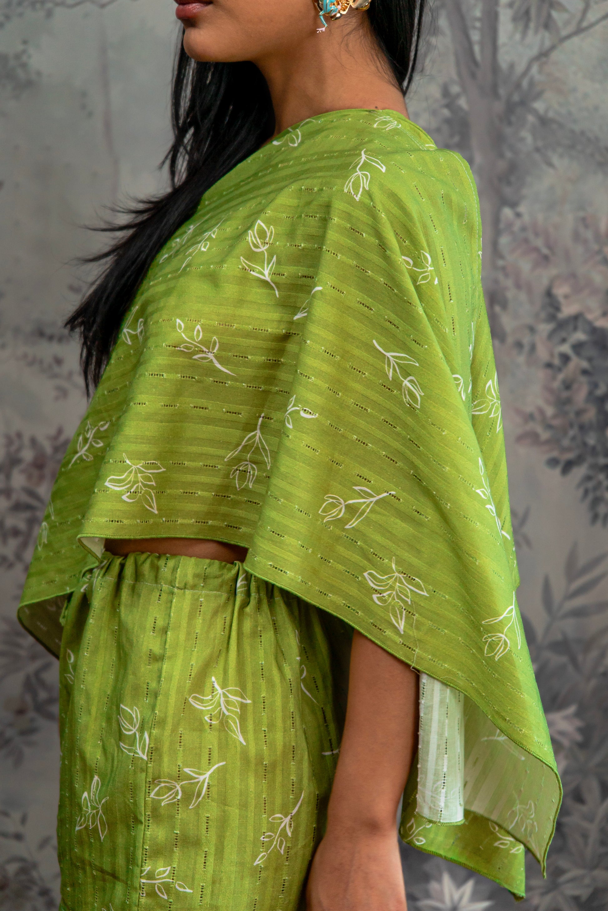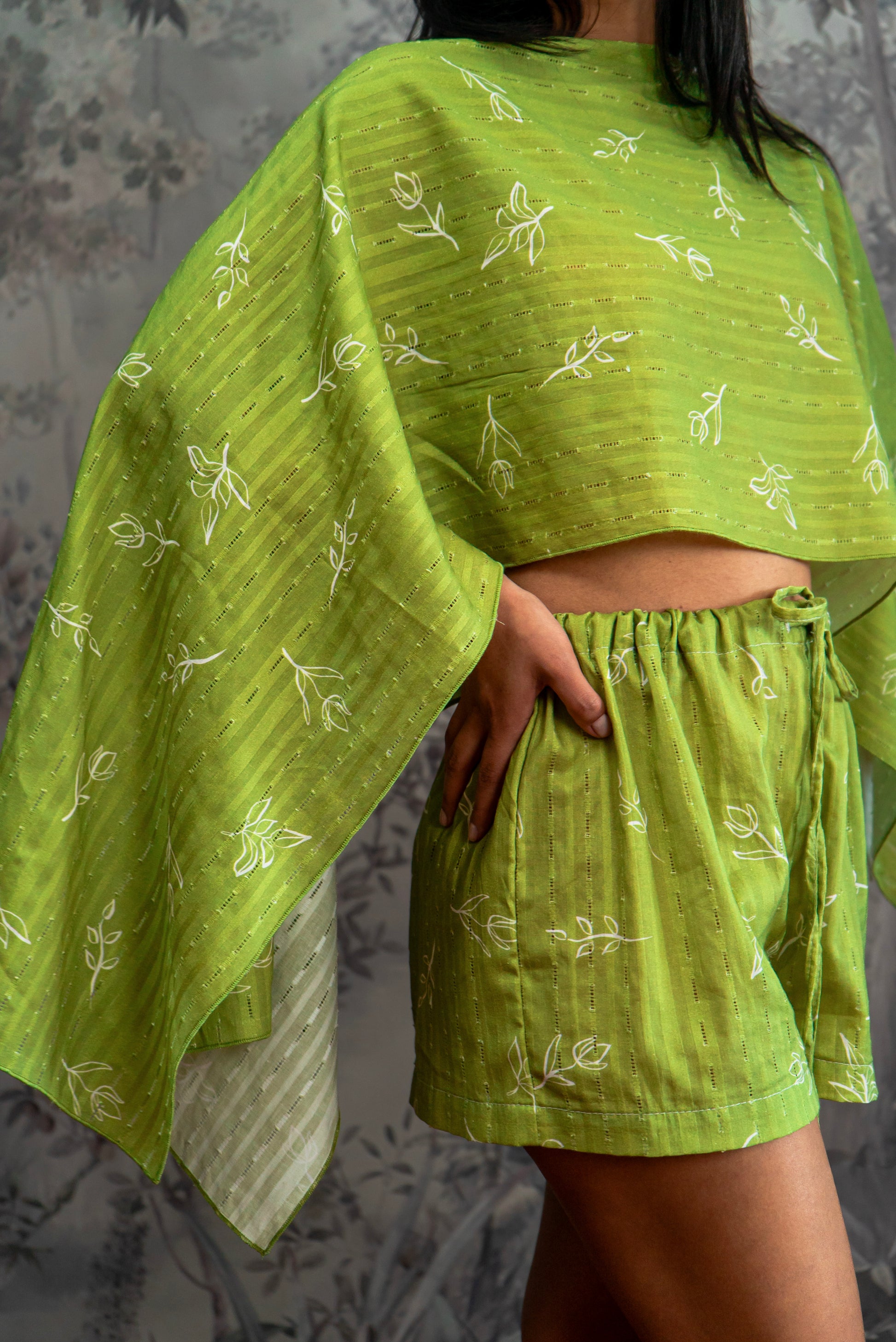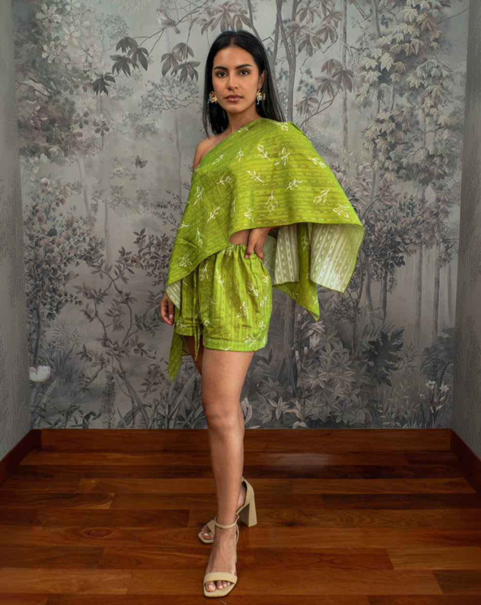 Matching Set confeccionado en algodón chaliz, una tela fresca, suave y ligera, ideal para climas cálidos. Incluye top asimétrico de un solo hombro con caída fluida y short de tiro alto con cintura ajustable, que aporta comodidad y un calce favorecedor. Su estampado delicado en tono verde evoca una estética natural y veraniega, perfecta para un look relajado pero sofisticado.