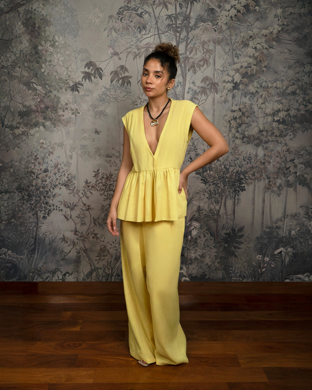 El Soleia Set incluye una blusa sin mangas con escote profundo en forma de “V” y base tipo péplum, más un pantalón de silueta recta y talle relajado. Confeccionado en lino con algodón, presenta una textura suave, ligera y apta para climas cálidos.
