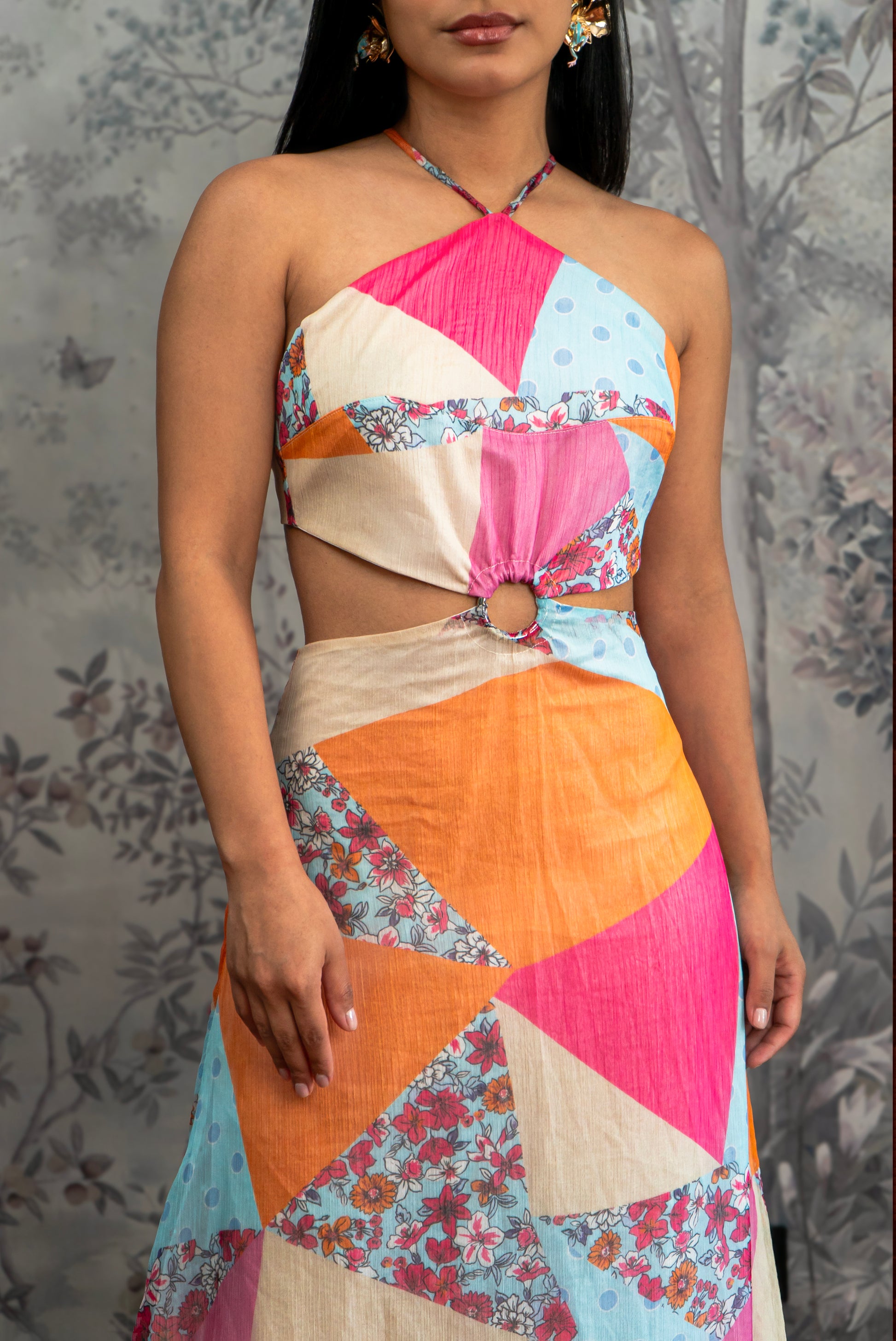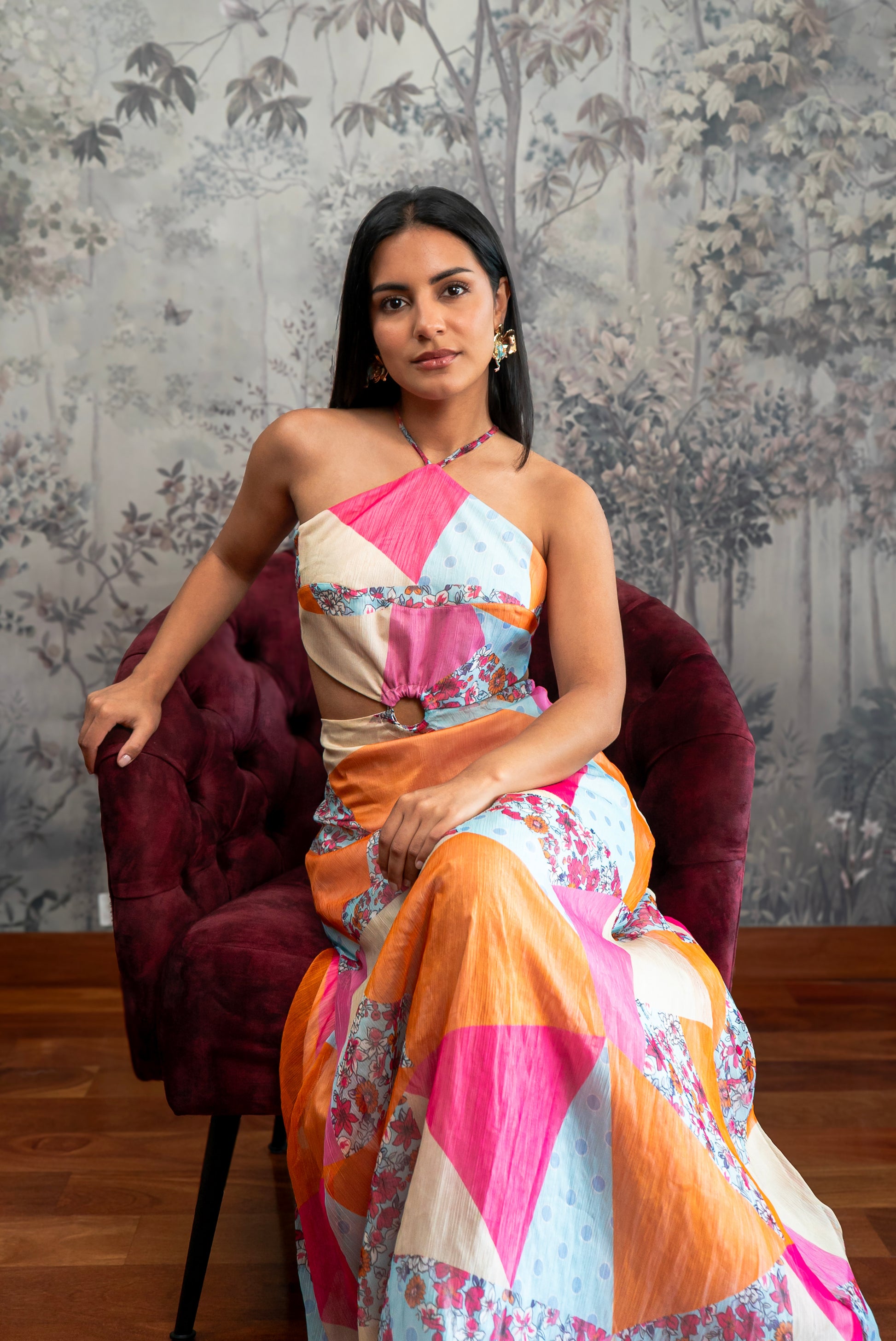 Maxi Dress confeccionado en gasa estampada, ligera y fluida. Presenta escote halter y cut-out frontal con aro que realza la silueta. La espalda es descubierta, con tirantes cruzados ajustables y aros decorativos, aportando un acabado delicado y femenino. Su estampado multicolor inspirado en el atardecer lo convierte en una pieza ideal para verano y ocasiones especiales.