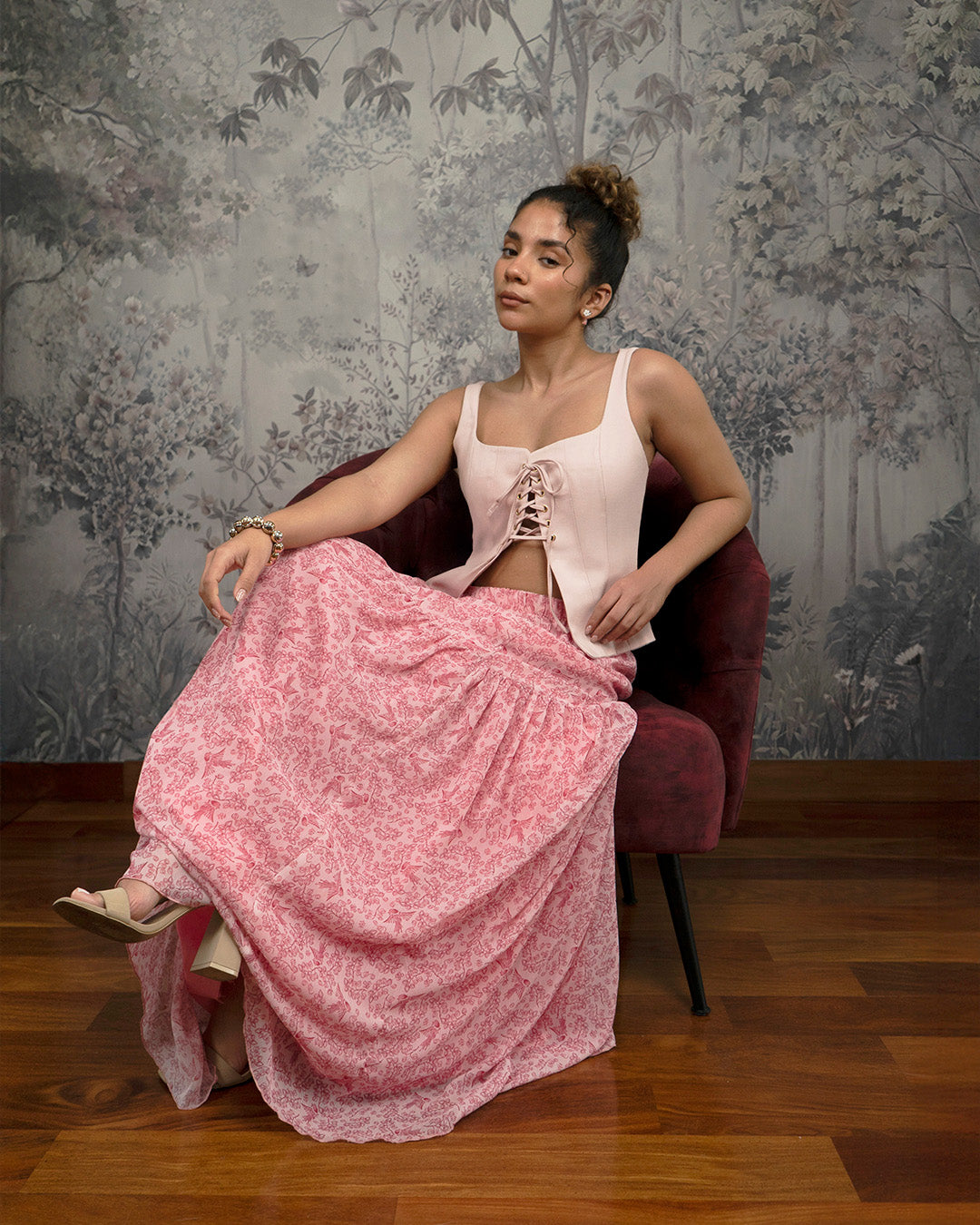 El Top Blush es un top estructurado con escote en forma de corazón y ajuste frontal con cordones que permiten graduar la silueta. Presenta un corte tipo corset sin varillas visibles, con piezas verticales que definen el torso. La espalda incluye cierre metálico expuesto en tono dorado para facilitar el calce. Confeccionado en drill de algodón licrado, ofrece firmeza, comodidad y un acabado liso en color palo rosa.