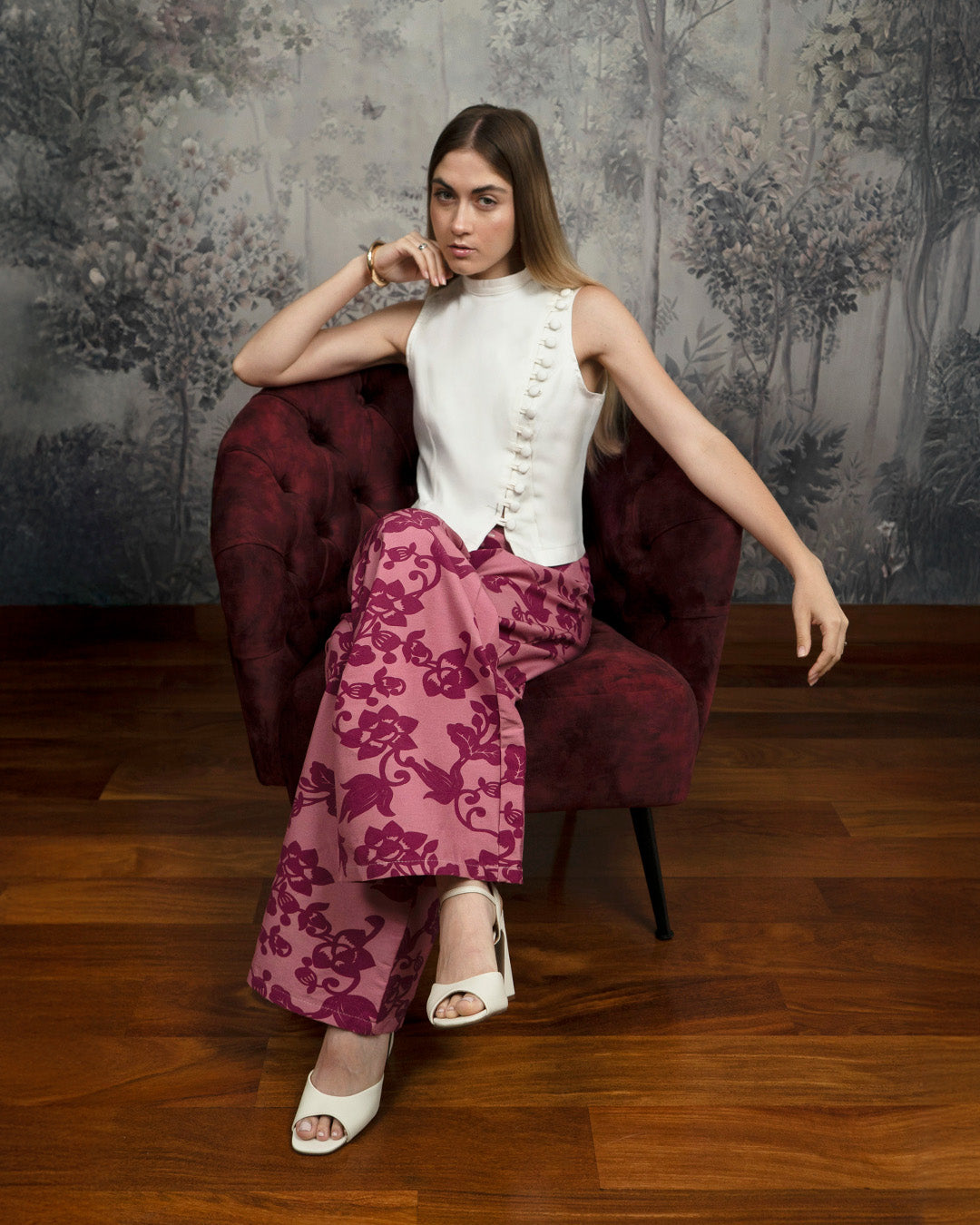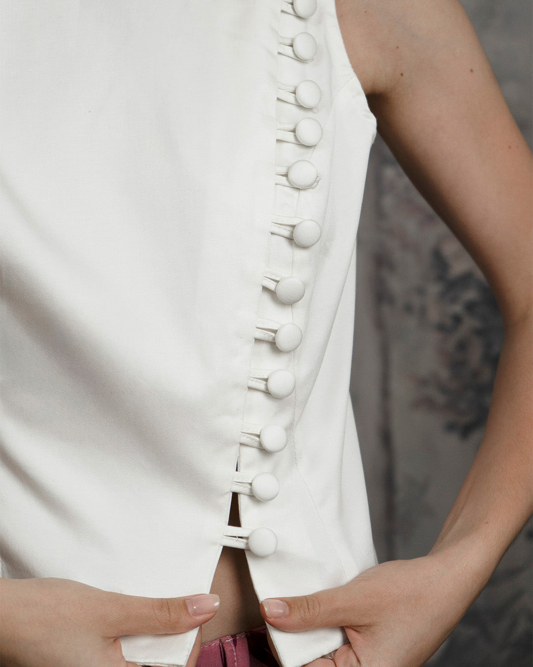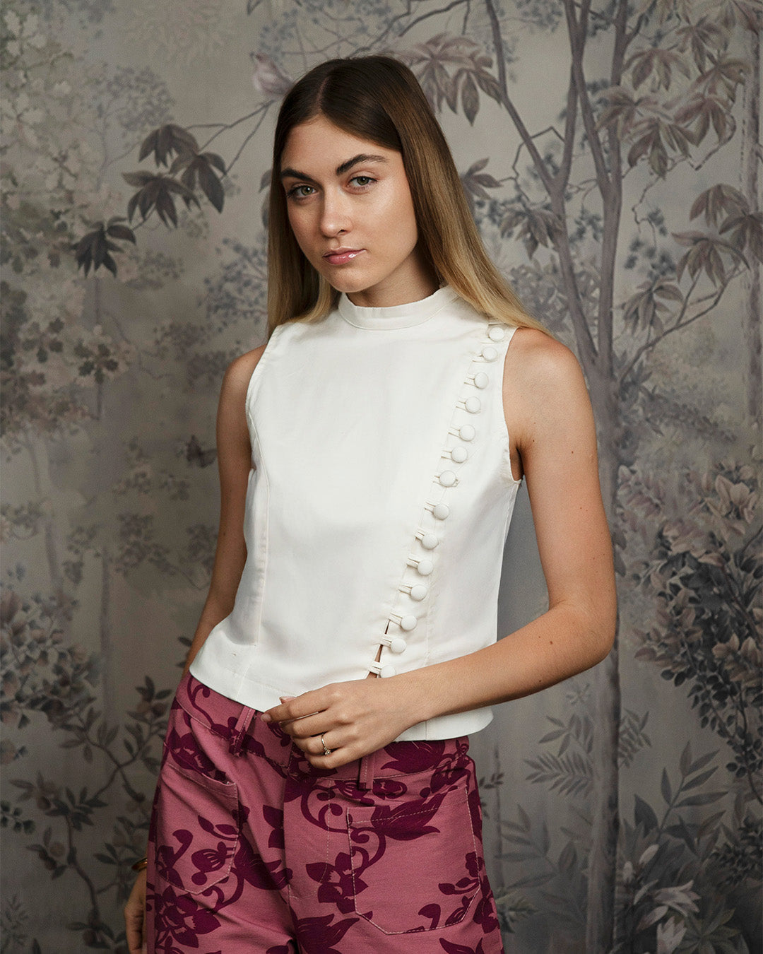 El Top Lía es un top estructurado sin mangas, con escote cerrado y diseño asimétrico en la parte frontal. Una línea diagonal de botones forrados del mismo tono se extiende desde el hombro hasta el bajo, funcionando como detalle decorativo. Confeccionado en drill de algodón licrado, lo que otorga estabilidad, suavidad y un acabado prolijo.