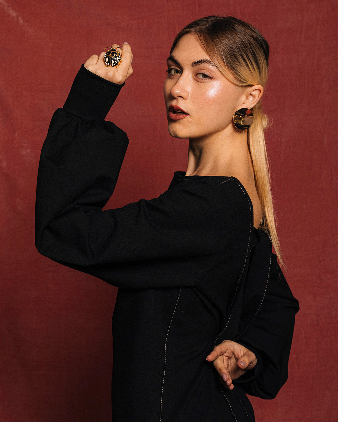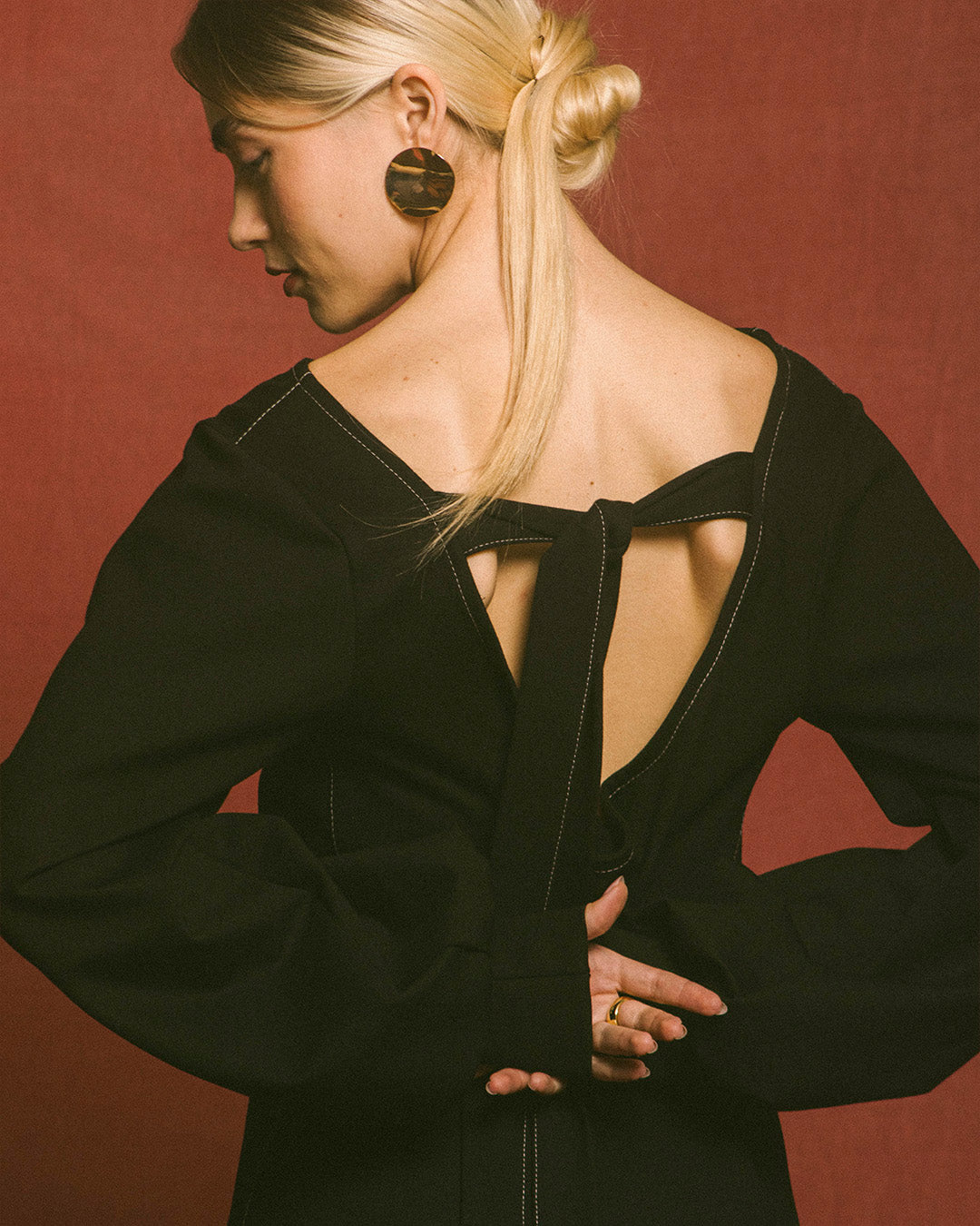 Vestido ceñido de algodón licrado, con un escote profundo en la espalda que se realza con un lazo largo y delicado, añadiendo un toque romántico y femenino. Los pespuntes blancos a contraste recorren la silueta como detalle visual sutil pero impactante. Una pieza pensada para resaltar tu figura con elegancia y suavidad.